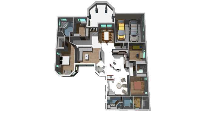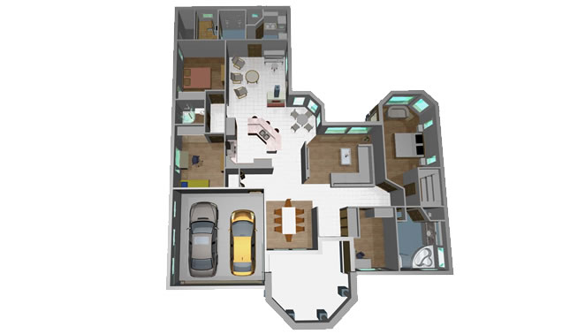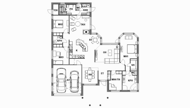 Pohjoisamerikkalainen huoneajattelu yhdistettynä suomalaiseen asumiseen. Talomallin avarat tilat ja valoisa master bedroom luovat tunnelmaa.